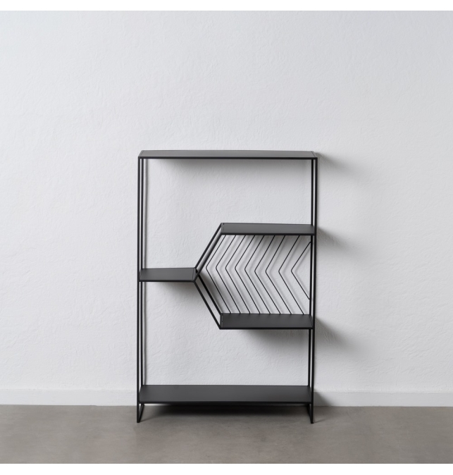 La Estantería Vento presenta un diseño moderno de hierro negro con varias baldas para almacenamiento.